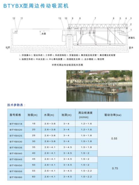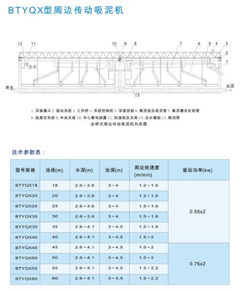 周邊傳動吸泥機適用于污水處理廠幅流式二次沉淀池。其主要功能是將沉降在池底的污泥刮集至一組平徑方向布的吸泥管管口,再通過中心泥管出,以便污泥回流或濃縮脫水。視情況需要,還可以設置池面刮機構,收集池面浮并通過浮渣漏斗排出池外