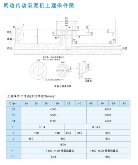 周邊傳動吸泥機根據出泥形式可以分為虹吸式和自流式。通常采用虹吸式,因其沒有動密封,能夠避免上清液短流。根據工作橋和吸泥管的區別可以分成全橋和半橋兩種形式。虹吸式吸泥機由工作橋、吸泥管系,集泥槽、虹吸管抽真空系統、中心泥罐、中心支座、驅動機構、中心集電裝置、電控箱等主件和出水三角板、穩流筒、擋板、浮刮板等附件(可選)成工作橋由安裝在周邊的驅動機構帶動,繞安裝在池中心支上的中心支座旋轉、沉淀在池底的污泥由集泥板集至各吸泥口,在液位差作用下,污混經吸泥口、集泥槽、虹吸管、中心泥罐、排泥管排至池外,每個吸泥管上端設有描調節機構,以調節各吸混管的流量和濃度。液面上的浮在浮板和周邊擋流板形成的縮區域內集中,由浮渣耙至集造斗,出池外設備外形圖,技術參數和土建條件尺寸見圖表。