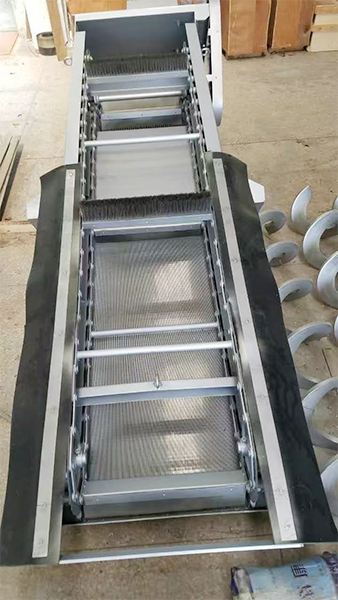 每臺格柵有兩條運輸鏈條。安裝時首先把運輸鏈輪軸放到極限位置,待鏈條掛上后再升高大鏈輪軸到要求的位置。運輸鏈條上安裝著板刷,為避免板刷安裝后出現傾斜,在安裝運輸鏈條時,應調整大鏈輪軸水平,這樣裝配后,才能保證板刷處于水平位置。